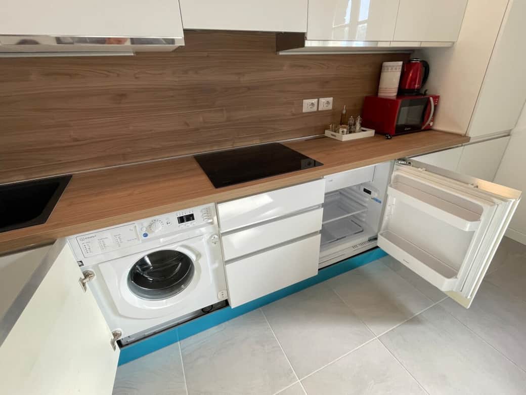 Kitchen, Coffee machine, Dishwasher, Kitchen stove, Microwave, Oven, Refrigerator, Toaster, Cleaning Products, Coffee, Cooking basics, Dining table, Dishes and silverware, Freezer, Hot water kettle, Wine glasses